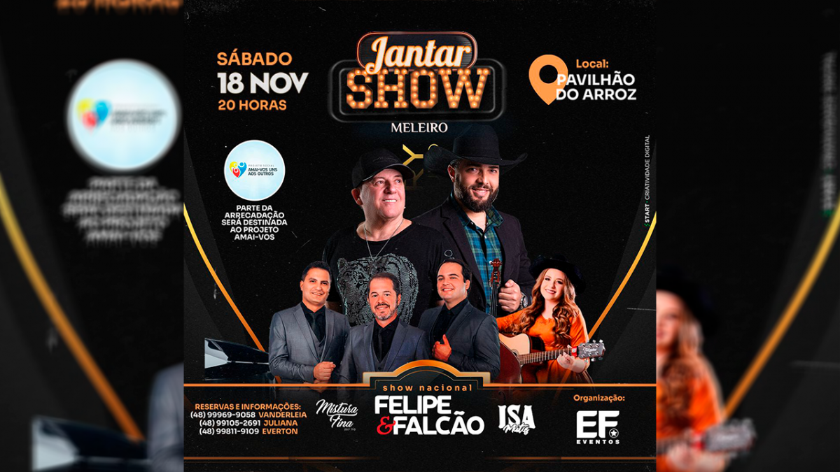 Jantar Dançante com show da dupla Felipe e Falcão e banda Mistura Fina será no dia 18 de novembro, no Pavilhão do Arroz.