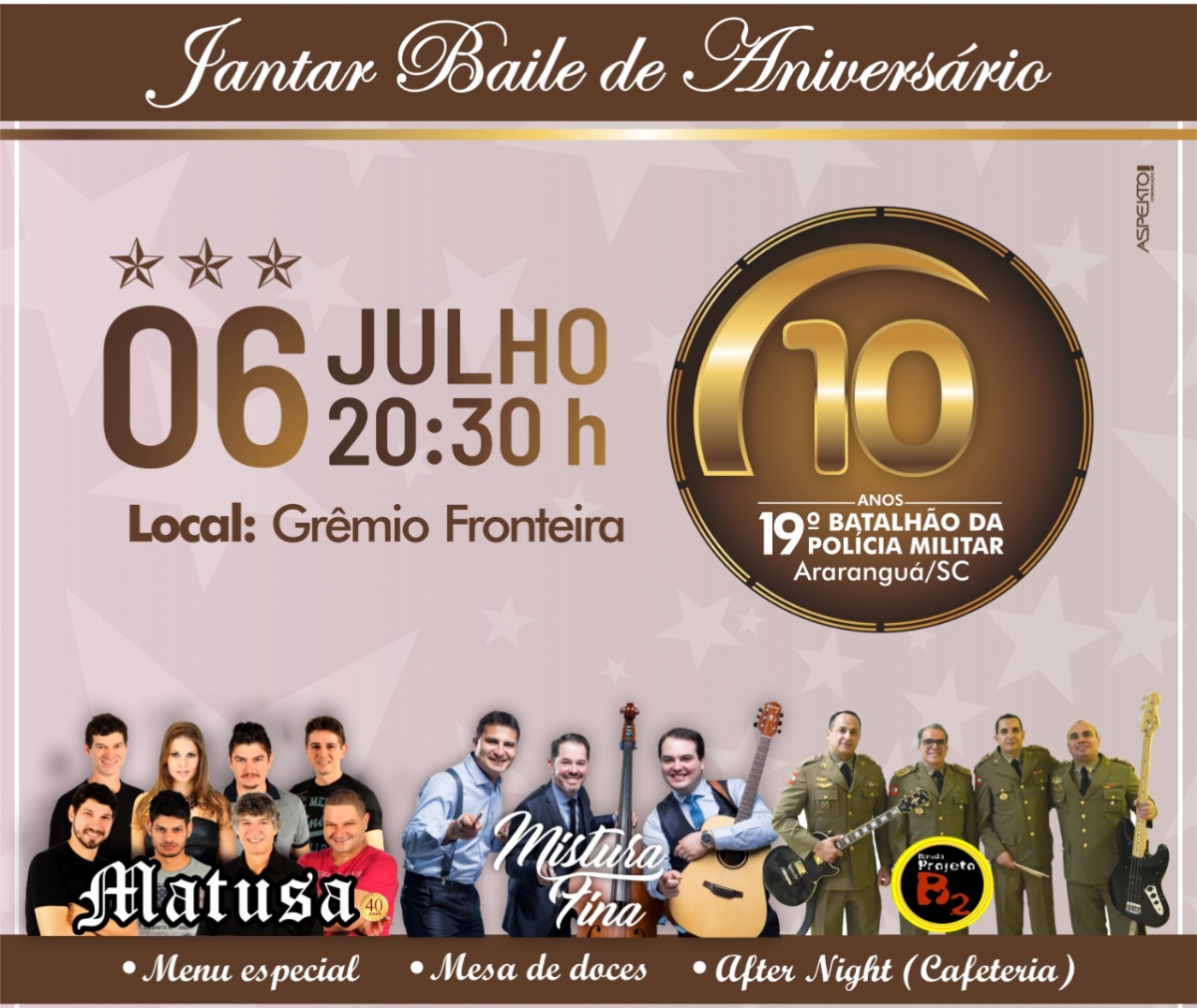 No Jantar Baile, serão comemorados os 10 anos de implantação do batalhão da PM em Araranguá. O evento acontece no Grêmio Fronteira, a partir das 20h30. As bandas Mistura Fina, Matusa e Projeto B2 são as atrações musicais confirmadas. “O Traje é passeio completo (terno e gravata). Mulheres o correspondente”, explicou o comandante.